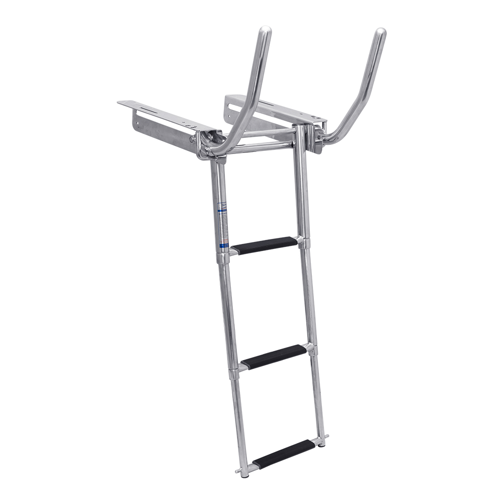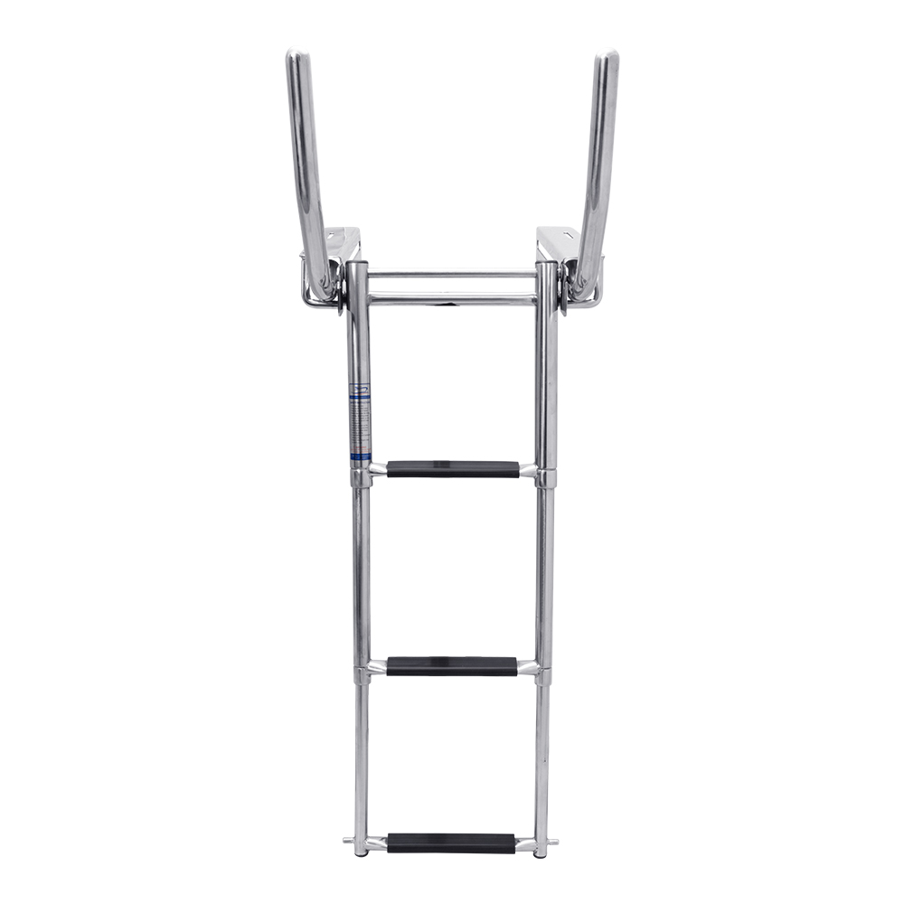 While stored, the ladder uses a notch in the bracket itself to stow the spring-loaded ladder with a built-in retaining pin. This keeps the ladder safely stored until you’re ready to use it! To deploy, simply press the ladder in, lift out of the notch, and the internal springs help to extend the ladder for you!